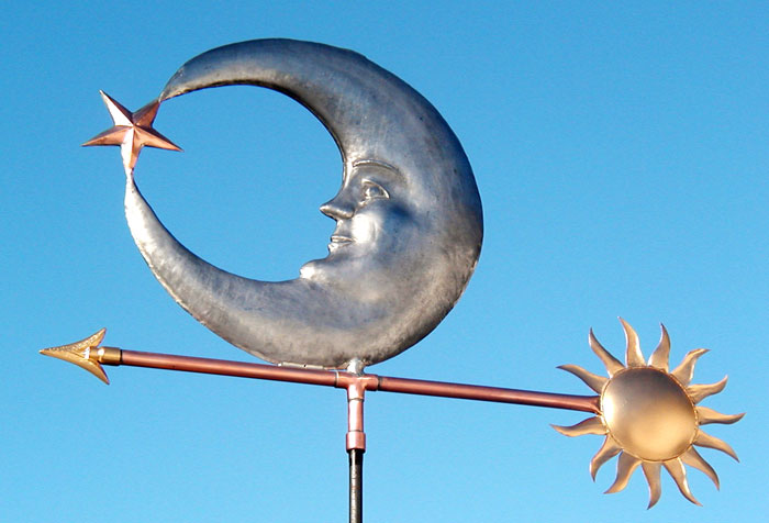 As with all of the weathervanes here, this Sun, Moon and Star Weathervane was custom made by hand on request,